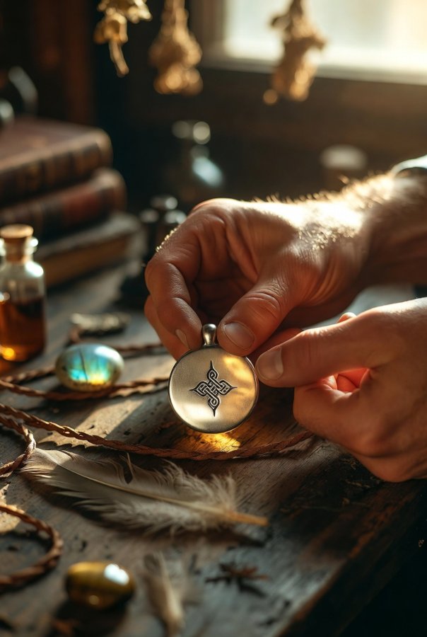 Vient ensuite le pilier de la Connexion personnelle. Un talisman n’est pas un objet générique ; il est l’écrin d’une relation unique entre l’objet et son porteur. Il doit donc profondément résonner avec ce dernier, que ce soit par une affinité esthétique (une forme ou une couleur qui attire irrésistiblement le regard), une résonance symbolique (un animal totem, une rune porteuse de sens) ou un lien émotionnel (une pierre héritée, un motif évoquant un souvenir fort). Cette harmonie est essentielle, car elle garantit que le talisman sera porté ou placé avec amour et confiance, activant ainsi son potentiel.