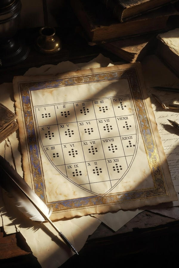 Le « Bouclier Géomantique » est la structure visuelle qui accueille ces figures. Imaginez un schéma en quinconce. Sur la ligne du bas, vous placez les quatre Mères de gauche à droite (Mère I, II, III, IV). Juste au-dessus, vous disposez les quatre Filles dans le même ordre (Fille I, II, III, IV). Sur la ligne suivante, vous positionnez les quatre Nièces (Nièce I, II, III, IV). Au sommet de cet édifice, les deux Témoins et le Juge achèvent la construction. Le Témoin Droite est issu de la comparaison des première et deuxième Nièces, le Témoin Gauche de la comparaison des troisième et quatrième Nièces. Enfin, le Juge, figure ultime de synthèse et de réponse, est engendré par la comparaison des deux Témoins.