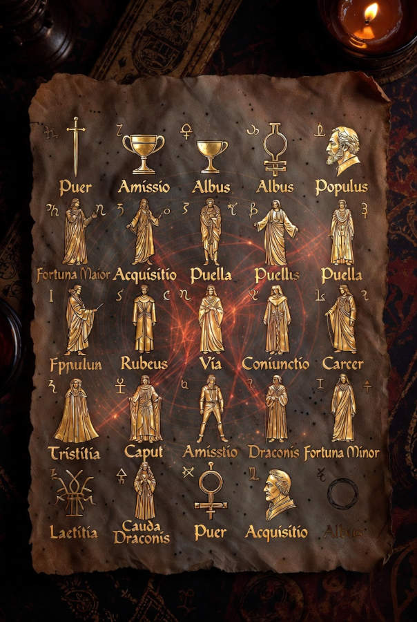 Ces seize configurations ne sont pas de simples signes ; ce sont de véritables archétypes, chacun portant un nom latin évocateur, une traduction et une série de mots-clés qui en capturent l’essence. Prenons par exemple Via (La Voie), une figure favorable associée au mouvement, au chemin et à la progression. À l’opposé, Populus (Le Peuple) représente la foule, la collectivité et est de nature neutre, reflétant l’influence du groupe. D’autres, comme Rubeus (Le Rouge), sont considérées comme défavorables, symbolisant la passion destructrice, la colère ou le chaos. Chaque figure possède ainsi sa propre polarité, oscillant entre des qualités actives ou passives, rapides ou lentes, lumineuses ou obscures, créant un jeu de miroirs où chaque archétype trouve son contraire et son complément.