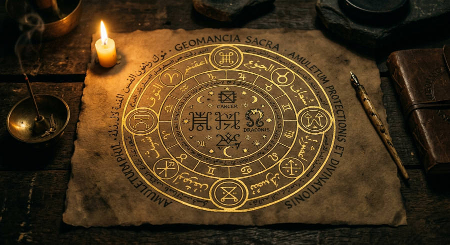 La création d’un talisman géomantique transforme l’énergie subtile des figures en un objet tangible, véritable condensé de puissance symbolique. Chaque figure géomantique représente en effet une formule énergétique spécifique : Laetitia incarne ainsi l’expansion, la joie et la percée ; Tristitia se concentre sur la protection, l’introversion et la consolidation. C’est précisément lors de la consultation, par le biais d’un tirage, que s’identifie le besoin fondamental – par exemple, un besoin de stabilité mène naturellement à la figure Fortuna Major, symbolisant la réussite stable et protégée. Le talisman devient alors l’artefact créé pour manifester et ancrer durablement cette énergie dans la réalité quotidienne de son possesseur. Pour des situations plus complexes ou des objectifs personnalisés, la géomancie offre la possibilité de créer des Figures Composites, comme le Témoin ou le Juge, permettant de concevoir des talismans à l’action multidimensionnelle, synthétisant plusieurs influences en une seule forme pour une réponse parfaitement adaptée à une problématique unique. Le rituel de création lui-même est un processus sacré : il commence par la purification de l’espace et des matériaux, se poursuit par la gravure ou le tracé de la figure choisie sur le support (pierre, métal ou bois) lors d’un moment astrologiquement favorable, et s’achève par une cérémonie de charge où l’intention est clairement formulée et infusée dans l’objet, scellant ainsi l’alliance entre le symbole et sa manifestation concrète.