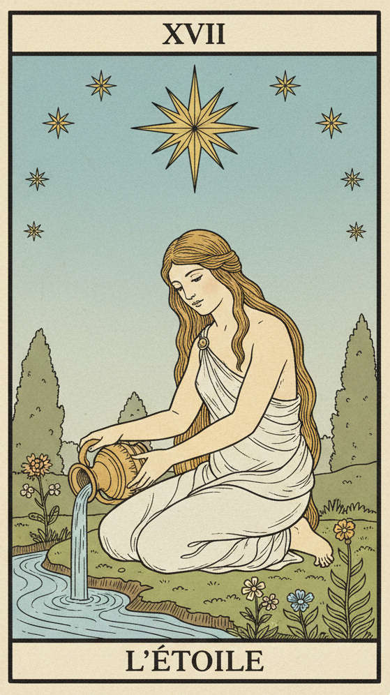 La carte de l’Étoile, dans le Tarot de Marseille comme dans le Rider-Waite-Smith qui en popularisa l’iconographie, dépeint une scène d’une sérénité et d’une pureté cosmique absolues. Au centre, une jeune femme nue, symbole de vérité et de vulnérabilité authentique, incarne une grâce tranquille. Agenouillée au bord d’un petit cours d’eau, elle opère un geste double et parfaitement équilibré : de sa main gauche, elle verse le contenu d’une urne dans l’eau, purifiant et nourrissant le flux de la vie ; de sa main droite, elle arrose la terre fertile avec une seconde urne, ancrant ainsi les énergies célestes dans le monde matériel. Cette posture, à la fois active et réceptive, illustre un équilibre harmonieux entre le don et la réception, entre le spirituel et le terrestre.