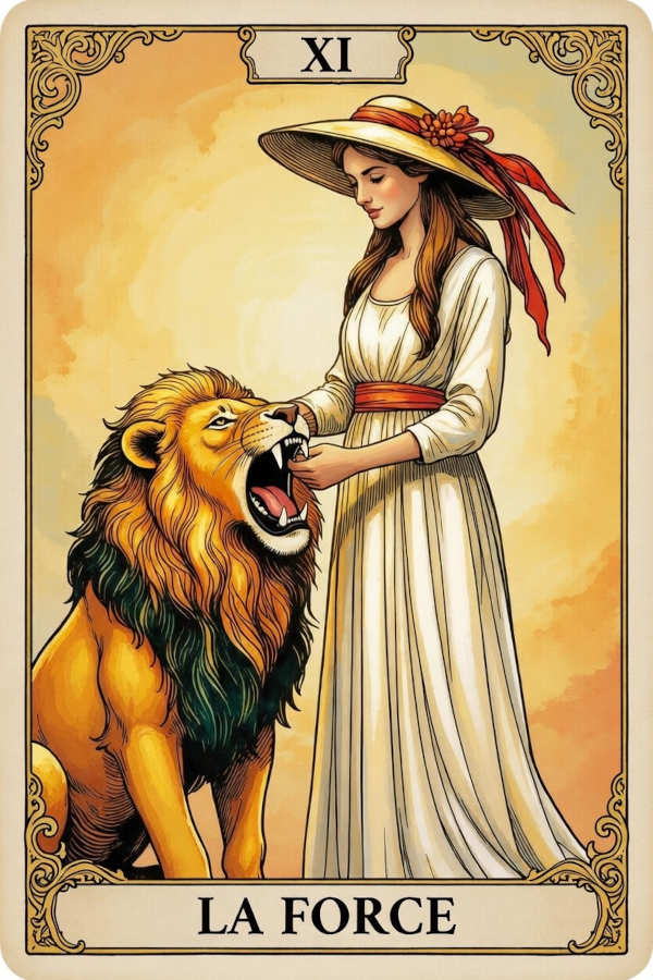 En résumé, La Force est l’arcane de la maîtrise intérieure, du courage doux et de l’harmonie des opposés – l’humain et l’animal, la conscience et l’instinct, la volonté et la compassion. Son message, à la fois universel et intemporel, nous rappelle que le plus grand défi et la plus grande victoire se jouent dans le paysage de notre âme. Prenez un moment pour méditer sur cette carte. Observez votre vie actuelle : où pourriez-vous remplacer une lutte épuisante par une maîtrise confiante ? Où pourriez-vous répondre par la douce fermeté au lieu de la réaction brute ? La Force nous invite finalement à redéfinir le vrai sens de la puissance : ce n’est pas la capacité de tout briser sur son passage, mais la vertu sublime de tout unifier en soi avec grâce et autorité sereine.