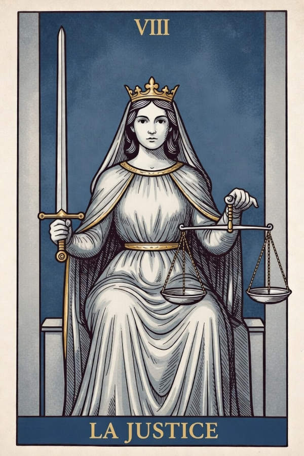 Plonger dans les racines du nom de cette lame, « Justice », nous conduit directement au cœur de sa signification. Le terme dérive du latin jus, qui évoque le droit, la loi et l’ordre légitime. Il ne s’agit donc pas d’une notion abstraite, mais du principe fondateur qui régit les sociétés et, par extension, l’équilibre cosmique. Cette idée d’équilibre parfait est magnifiée par la numérologie qui lui est associée : le chiffre 8. Symbole d’harmonie et de renaissance (venant après l’accomplissement spirituel du 7), le 8 représente la matérialisation des lois, le karma dans sa dimension la plus tangible, et la juste rétribution des actes. Il dessine le signe de l’infini, rappelant que toute cause engendre un effet. Traditionnellement, la Justice entretient des correspondances puissantes avec le signe astrologique de la Balance, archétype de l’équilibre, du jugement et des relations contractuelles, ainsi qu’avec la planète Vénus, maîtresse de l’harmonie et de la juste valeur des choses. Enfin, sa loi immuable trouve un écho direct dans la dynamique de l’Arcane X, la Roue de Fortune, qui illustre le cycle incessant des causes et des conséquences, où chaque action, bonne ou mauvaise, finit par revenir à son point d’origine, sous le regard impartial de la Justice.