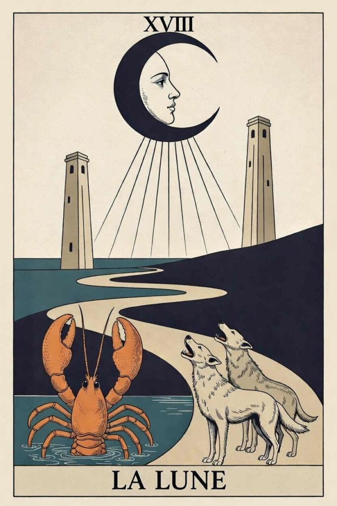 La carte de la Lune, dans sa représentation classique (Rider-Waite-Smith ou Tarot de Marseille), déploie un paysage nocturne d’une puissance symbolique rare, immergeant le regardeur dans une atmosphère onirique et mystérieuse, teintée d’une douce anxiété. Dominant la scène, l’astre lunaire exhibe son visage énigmatique, entouré de seize rayons acérés et de seize gouttes – ou larmes de lumière – qui tombent du ciel. Cette pluie lumineuse éclaire le monde d’une pâle clarté, soulignant la dualité fondamentale de la carte : la lumière froide de la raison (les rayons) peine à percer l’obscurité des émotions et de l’inconnu (la nuit). Au premier plan, un étendue d’eau sombre et calme représente l’inconscient collectif, les profondeurs mystérieuses de l’âme d’où émerge un Cancer (ou une écrevisse). Ce crustacé symbolise l’instinct primitif, la part refoulée de nous-mêmes qui monte lentement à la surface de la conscience. Un chemin sinueux s’enfonce dans l’obscurité entre deux hautes tours, ces piliers marquant la frontière périlleuse entre le monde connu et les territoires inexplorés de l’esprit. Enfin, un chien et un loup (ou deux chiens) hurlent à la lune, incarnant la tension entre nos peurs domestiquées, sociales, et nos terreurs instinctives, sauvages. Ensemble, ces éléments tissent une allégorie saisissante du voyage intérieur : un parcours nécessaire mais inquiétant à travers les illusions, les rêves et les ombres de notre propre psyché.