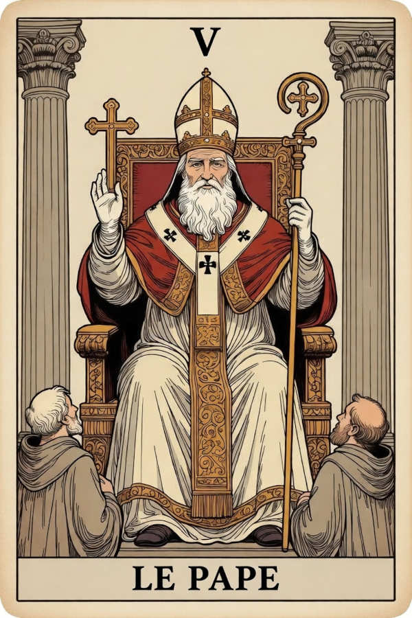 Assis solennellement sur son trône de pierre, flanqué de deux colonnes qui évoquent la structure et la dualité du monde manifesté, le Pape de l’iconographie tarologique (notamment du Rider-Waite) incarne l’autorité spirituelle et la sagesse organisée. Sa main droite levée dans un geste de bénédiction est bien plus qu’un signe religieux ; elle symbolise la transmission active du savoir et de la grâce du monde supérieur vers le monde terrestre. Il tient la crosse à triple croix, un symbole puissant représentant sa souveraineté sur les trois plans de l’existence : le physique, le mental et le spirituel. Sur sa tête repose la tiare à trois couronnes, affirmant sa triple autorité en tant que guide des corps, des âmes et des esprits. À ses pieds, deux clés croisées, l’une en or et l’autre en argent, indiquent qu’il détient les moyens d’ouvrir les portes de la connaissance cachée et des mystères, équilibrant le conscient et l’inconscient. Devant lui, deux disciples ou moines, l’un vêtu de rouge (la passion, l’action) et l’autre de bleu (la spiritualité, la contemplation), écoutent son enseignement, illustrant parfaitement le rôle de transmission du savoir et de perpétuation de la tradition. L’archétype qu’il incarne est celui du Maître, du Guide Spirituel et du Mentor. Il n’est pas le créateur solitaire de la vérité, mais son Gardien et son Interprète autorisé, celui qui structure, enseigne et transmet les lois, les rites et la connaissance sacrée à travers les âges, offrant un cadre et une direction à ceux qui cherchent un sens plus profond à leur existence.