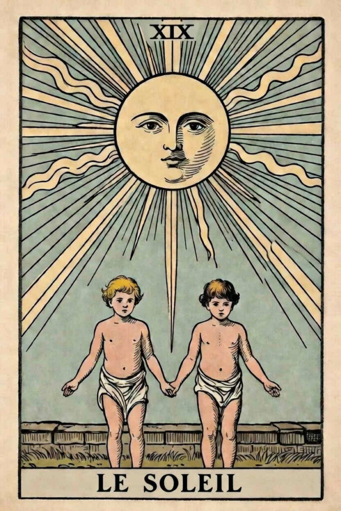La carte du Soleil dans le Rider-Waite-Smith dépeint une scène d’une joie absolue et d’une vitalité éclatante, où chaque élément rayonne de sens. Au centre, un grand soleil, dont le visage bienveillant et les rayons tantôt droits tantôt ondulés illuminent la scène, symbolise la conscience pleinement éveillée, la vérité qui dissipe les ombres et la réussite éclatante qui couronne les efforts. Sous cette lumière triomphante, deux enfants nus, souvent interprétés comme jumeaux, dansent ou s’étreignent dans un jardin. Ils représentent l’innocence retrouvée, la joie pure et sans artifice, et l’harmonisation des dualités (conscient/inconscient, raison/émotion) en une unité heureuse. À leurs pieds, de vigoureux tournesols tournent leur corolle vers la source de vie, illustrant l’attraction irrésistible de l’âme vers la lumière, la croissance et une vitalité florissante. À l’arrière-plan, un mur de pierre bas et solide délimite cet espace idyllique ; il ne figure pas une prison, mais une protection rassurante et l’aboutissement positif d’un cycle, marquant un accomplissement désormais stable et à l’abri des tumultes extérieurs. Cette iconographie riche contraste avec la représentation plus dépouillée du Tarot de Marseille, où le soleil, seul, verse sa lumière depuis le ciel sur deux personnages (souvent un couple) se tenant au sol, mettant ainsi l’accent sur la bénédiction céleste et l’illumination reçue plus que sur l’expression d’une joie intériorisée et partagée.