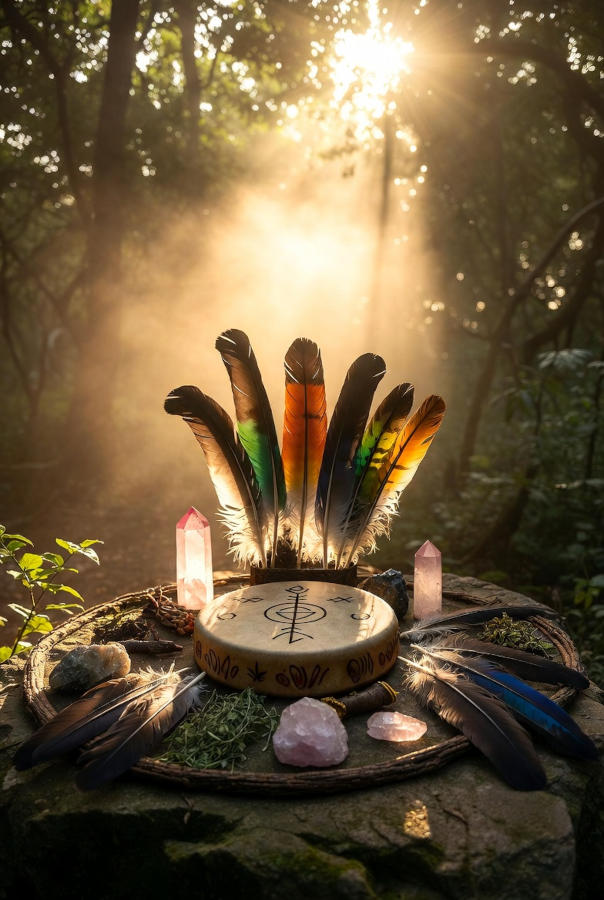 Dans la pratique chamanique, les outils ne sont jamais de simples objets décoratifs ou utilitaires ; ce sont des extensions de l’intention du guérisseur et des véhicules concrets pour naviguer dans les réalités subtiles. Parmi eux, le tambour et le hochet occupent une place primordiale. Souvent appelés « chevaux » spirituels, leur son répétitif et rythmé induit un état de conscience modifié, un voyage. Ces percussions agissent comme un guide, synchronisant les ondes cérébrales sur des fréquences spécifiques (thêta) qui ouvrent la porte aux mondes non-ordinaires, permettant au praticien de « chevaucher » le son pour explorer, diagnostiquer et soigner. Autour de ce noyau sonore gravitent les objets de pouvoir, chacun chargé d’un symbolisme profond : les plumes, messagères de l’air et de la prière ; les cristaux et pierres, condensateurs d’énergie et ancres terrestres ; les statuettes, représentations des esprits alliés. Les plantes sacrées, comme le tabac offert en gratitude, le cacao pour ouvrir le cœur, ou l’ayahuasca* utilisée dans des contextes traditionnels très stricts, sont considérées comme des enseignantes et des portails. Enfin, les éléments naturels – l’eau purificatrice, le feu transformateur, la terre stabilisatrice et l’air inspirateur – sont les forces primordiales avec lesquelles le guérisseur collabore. Il est crucial de comprendre que la puissance ne réside pas dans l’objet lui-même, mais dans la relation et l’intention que le praticien y investit. Ces outils servent de focalisateurs pour la conscience et de relais symboliques, créant un pont tangible entre le monde visible et les forces spirituelles invisibles qu’ils invoquent et canalisent.