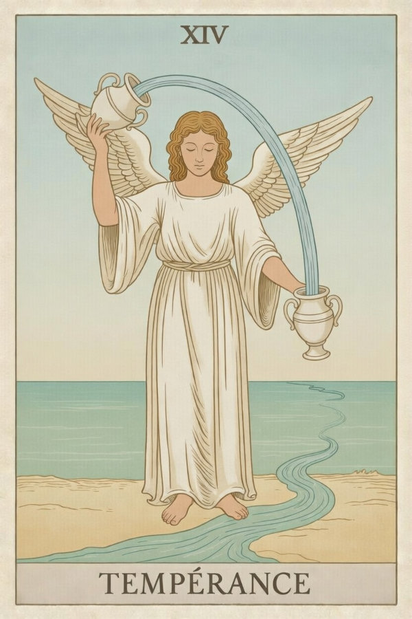 Dans un monde souvent défini par ses dualités et ses extrêmes, où tout semble osciller entre l’ombre et la lumière, l’action frénétique et l’immobilisme, la quête d’un point d’équilibre devient essentielle. C’est précisément dans cet espace sacré, à la jonction des forces opposées, que réside la puissance de la Tempérance, l’Arcane majeur numéroté XIV. Bien loin de l’image réductrice d’une simple carte de modération ou de retenue, la Tempérance se révèle comme l’Arcanum de la synthèse alchimique, de la patience active et de l’harmonie consciente. Elle nous enseigne l’art subtil de mélanger les contraires pour en faire émerger une troisième réalité, plus riche et plus durable. Dans cet article, nous explorerons en profondeur sa symbolique mystérieuse – de l’ange androgyne aux vases échangés –, son message spirituel profond et son interprétation pratique dans les tirages. Nous découvrirons comment cette carte, souvent mal comprise, recèle en réalité une puissance de transformation intérieure capable de guérir nos divisions et de nous guider vers notre centre le plus authentique et paisible.